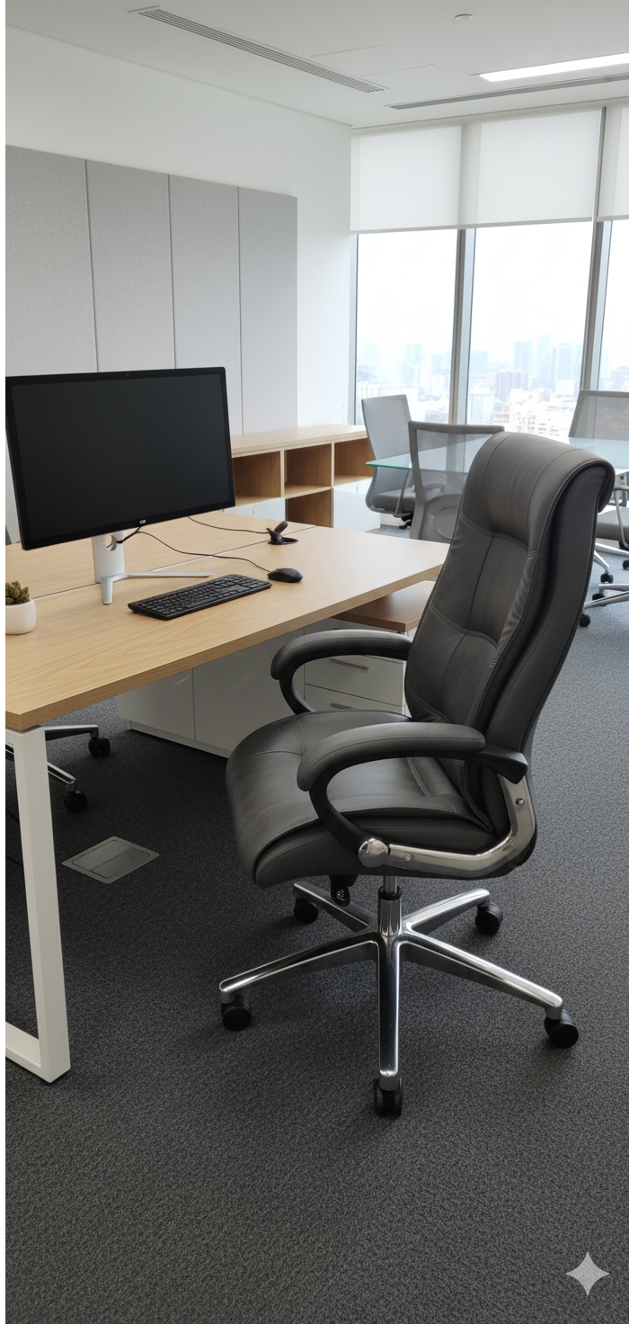 The most prominent object is a dark green leather executive chair with substantial padding, a high back, and a chrome five-star base with caster wheels. Its armrests are black with chrome accents.