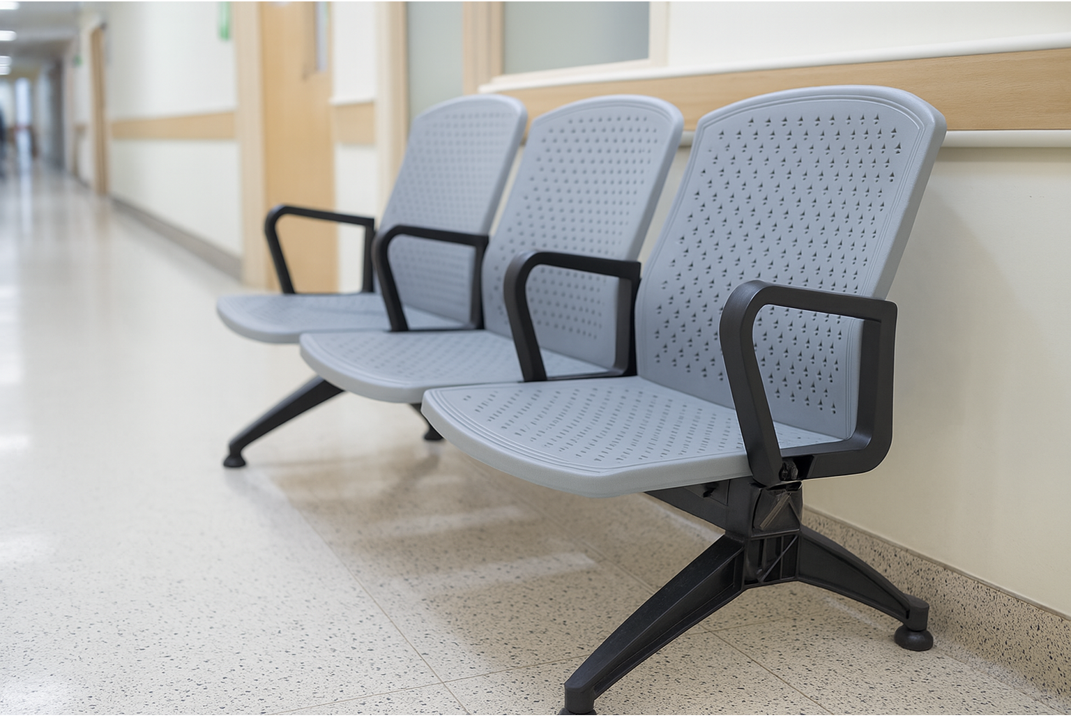 This image shows a row of three fixed-seat waiting chairs lining a clean, brightly lit corridor—most likely in a clinic or hospital. Each seat and backrest is molded from light-gray plastic, perforated with a regular pattern of small triangular vents for breathability.