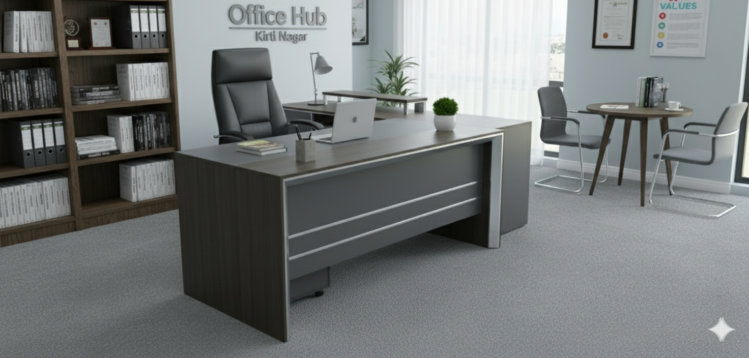 It has a dark brown wood grain finish on the side panels and a slightly lighter, smooth gray or charcoal finish on the main front panels and desktop. The front panels are accented with three horizontal chrome or silver strips, giving it a professional, sleek look.