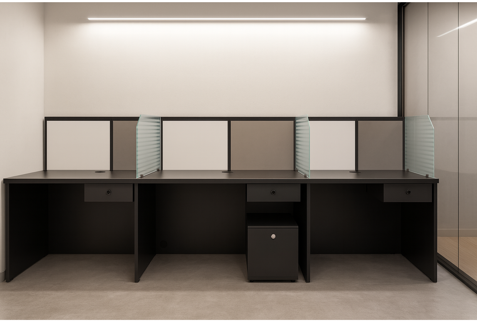 A modern 3-seater linear workstation in a minimalist palette. The setup features matte-black laminate desktops with slim under-desk pencil drawers, low privacy panels in alternating white and taupe, and ribbed frosted-glass side shields between seats.